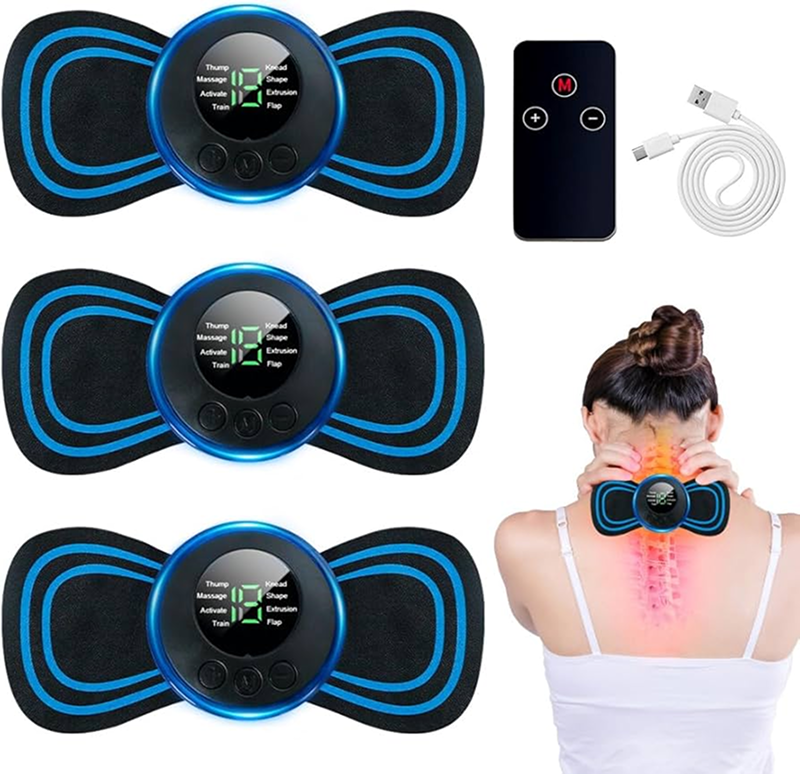 Butterfly-shape design – Two winged pads connected to a central control unit, designed to fit around muscles like the neck, arms, or lower back for optimal coverage.